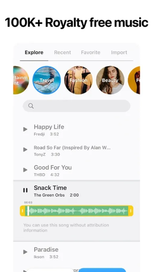 + Choose songs from 100,000+ royalty-free tracks ranked by real usage rate on YouTube.