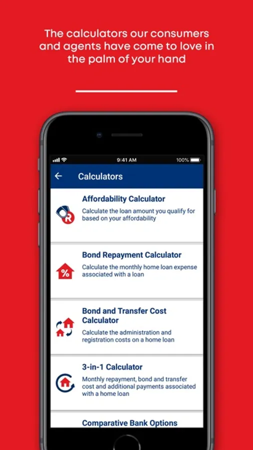 Calculators – Affordability calculator, bond repayment calculator, bond and transfer cost calculator. All results can be saved in PDF and emailed to client.