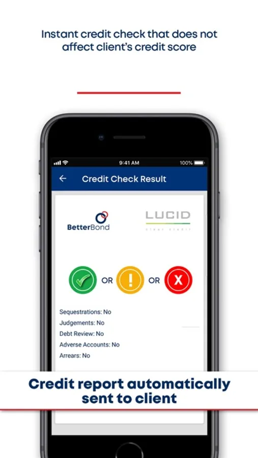 Quick credit check – Do a quick credit check on your client on the spot, just fill in a few fields and we will instantly pull a credit report and show the results on screen, at the same time sending the personalised report to the client.