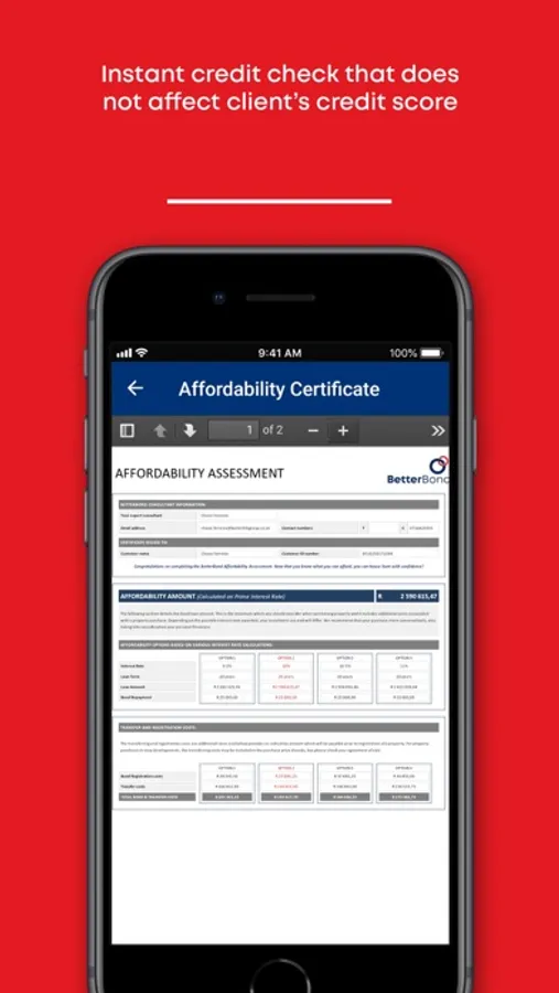 Affordability assessment – Fill in a few fields and get the credit results and a full breakdown of the clients affordability in a PDF format. These documents are automatically sent on to client with the user’s information. Certificate includes detailed breakdown of bond repayment options, deposit savings and bond and transfer costs.