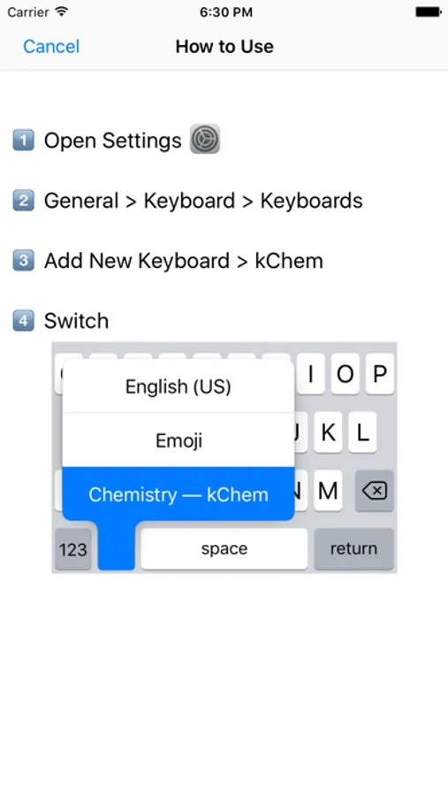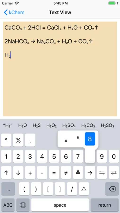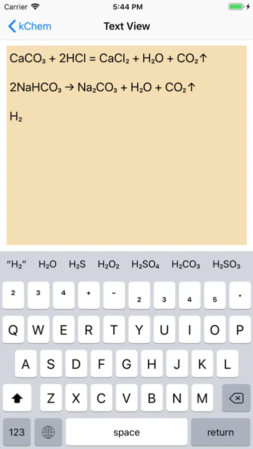 The kChem is a Keyboard Extension, designed for the user who needs to enter chemical formula in word, PPT, notes and other text apps on iPhone or iPad.