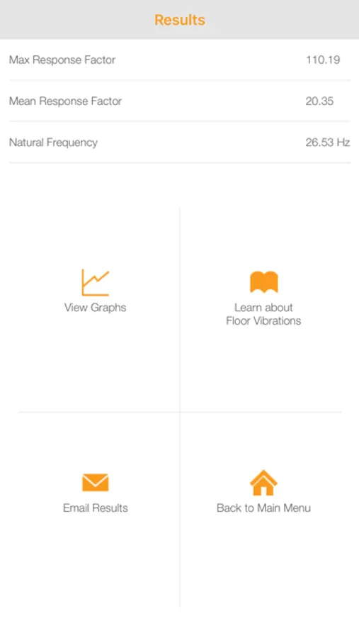 The user is also able to email their recording in csv format for later use. The app includes a helpful information section which explains the basics of vibrations and typically encountered levels in various occupancies.