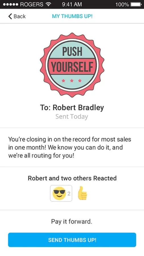 Increase employee satisfaction and engagement by sending "Thumbs Up"! To reward or motivate fellow employees or staff at a touch of a button from your mobile device.