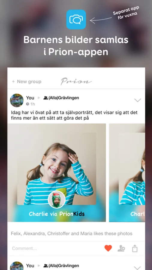 Prion Kids är en kamera vars lättanvända gränssnitt ger barn mellan 1-10 år möjligheten att ta bilder och dela med sig av vardagen ur deras perspektiv. Använd Prion Kids i leken och reflektera kring bilderna tillsammans eller använd systerapplikationen Prion för att smidigt dela vidare era favoriter till barnets nära och kära, exempelvis föräldrar eller mor- och farföräldrar.