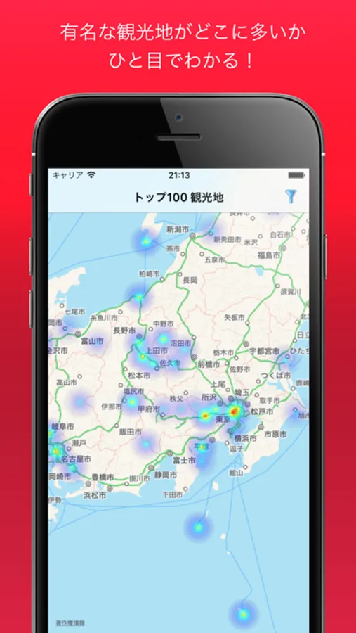 日本で有名な観光地を地図上に視覚化し、ひと目でどこに有名な観光地があるのか把握できます。観光であまり馴染みのない地域に訪れたときも、ヒートスポットマップを使えば近くにある有名地がすぐにわかります。