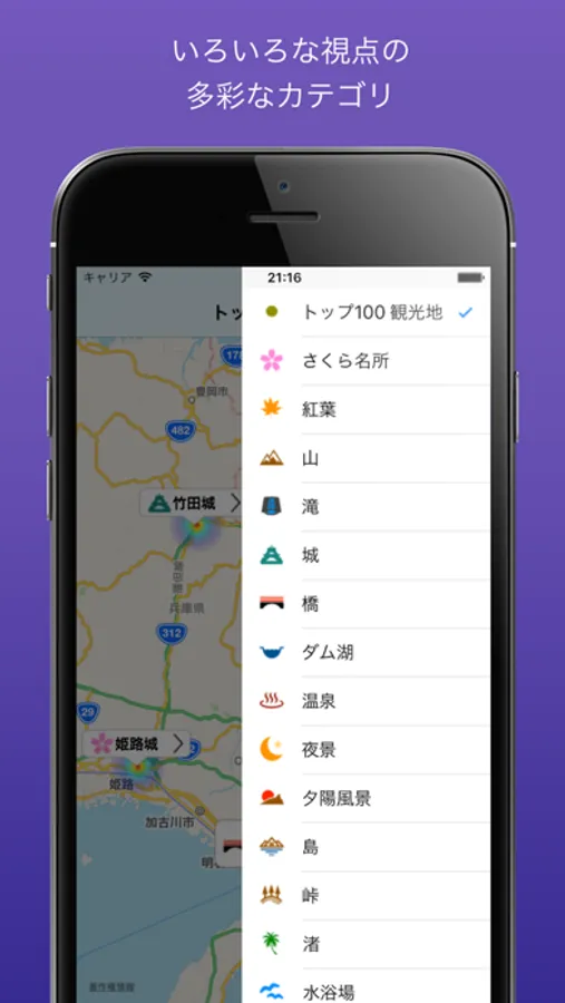 温泉地、日本名山、お城、さくらの名所、ダム、滝...など様々なカテゴリから有名な観光地を地図上に視覚化して表示します。