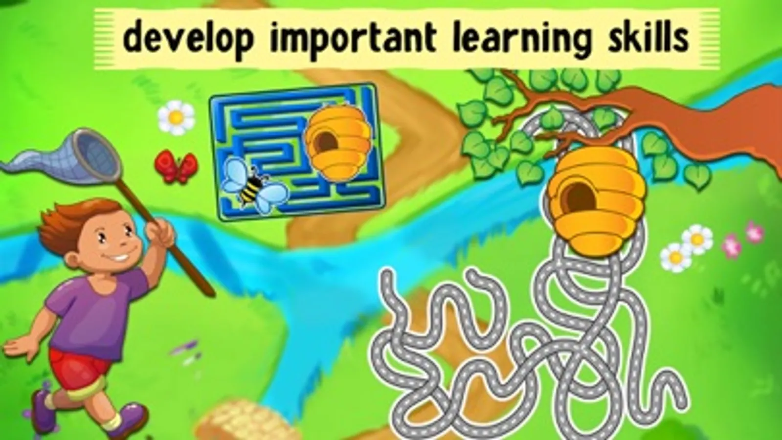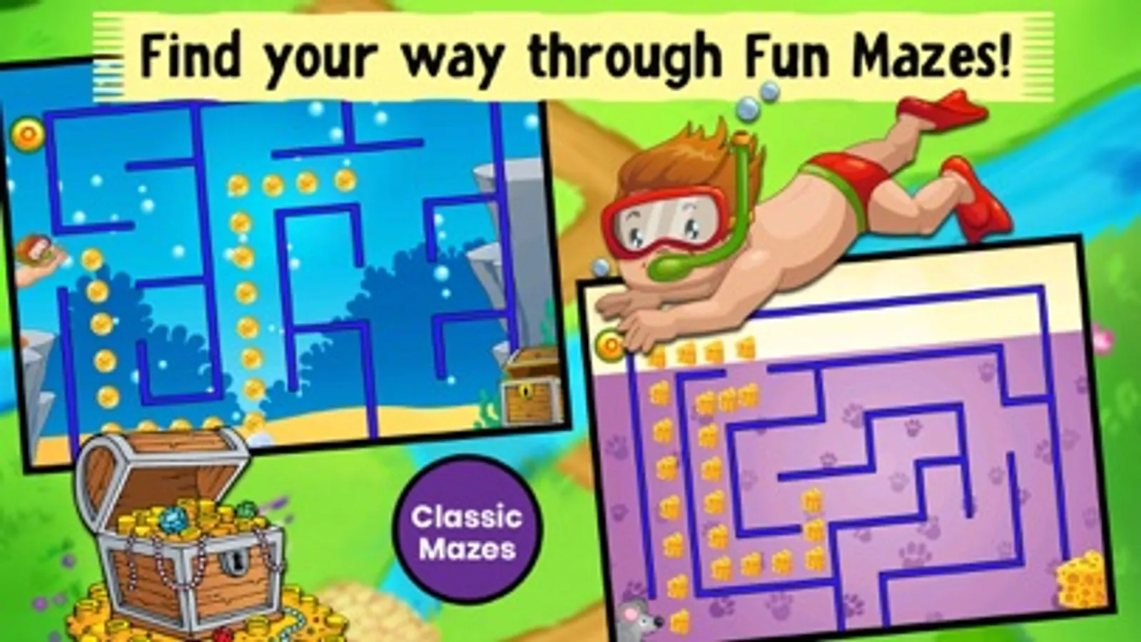 Drive the pirate to the treasure island, help the little kids in the school bus to find their way back to school, or take a walk through the underground sea with the diver, & much more mazes. Each maze has a new adventure theme, with lively cartoon illustrations, fun characters and tons of animated objects to explore!