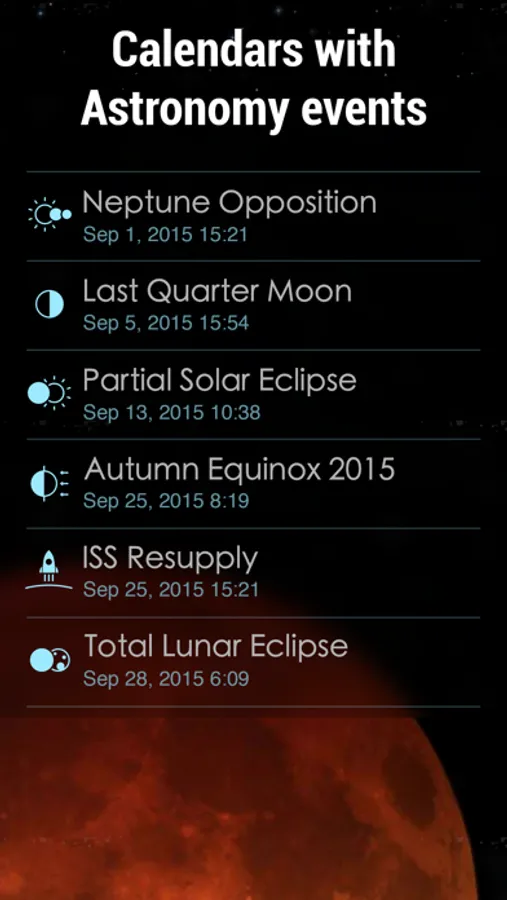 ► Astronomy calendar of Solar Walk 2 Ads+ includes various astronomical events and events related to space exploration (the launching of satellites, the first landing on the moon, etc). Choose any date and time and travel in time observing the most interesting celestial events of different periods.