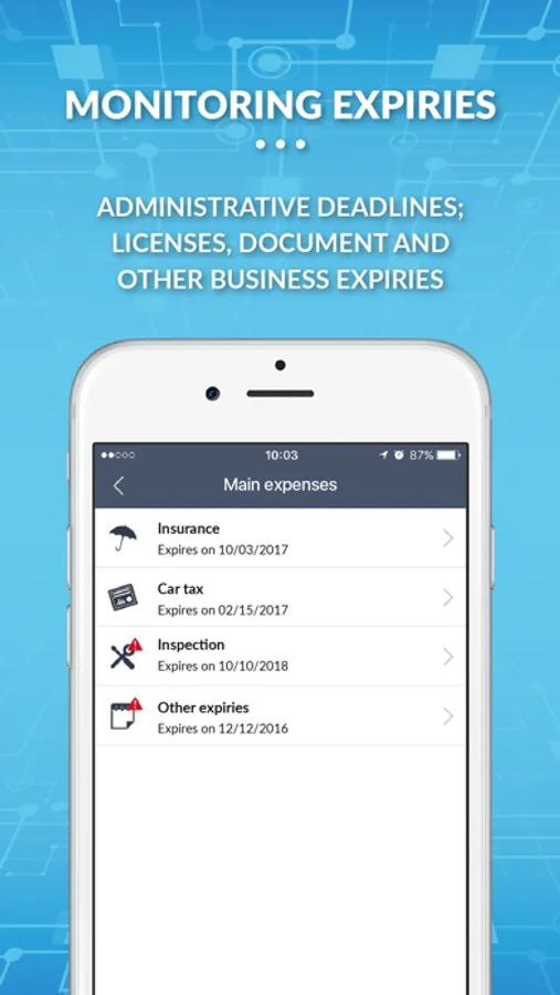 Track and analyze expiries and real costs of your company's assets, make strategic choices easier and make use of the possibility of saving money and improve performance through continuous monitoring that ensures the reliability of your vehicles: