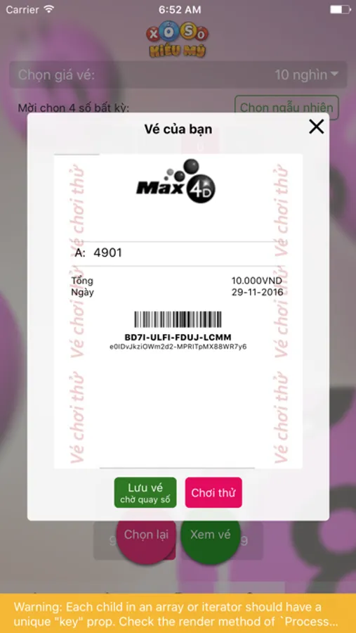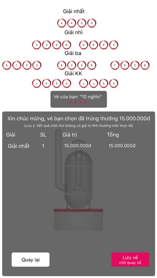 Sau khi chọn lưu vé chơi thử, người chơi sẽ được hệ thống thông báo kết quả xổ số Vietlott của kỳ quay tiếp theo. Hệ thổng sẽ thông báo kết quả bạn trúng bao nhiêu theo quy định Giá trị giải thưởng của Công ty xổ số Điện toán Việt Nam. Bạn cũng có thể xóa vé đã chơi và giữ các vé khác.