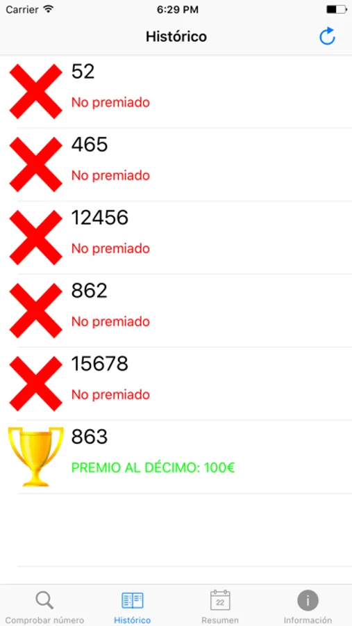 -Todos los números comprobados se añadirán a un histórico en el que podrás ver si están premiados o no sin volverlos a introducir y de un solo toque. Puedes borrar números fácilmente deslizando la celda a la izquierda, o refrescar tirando de la tabla hacia abajo.