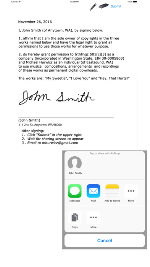 “My John Hancock” is an iOS (iPhone, iPad) agreement-signing app. Currently, it is only intended for use by us (Irthlingz), to facilitate getting agreements signed for using musical compositions, arrangements and recordings in apps, such as our apps on the Apple App Store. Typically, it is used by a copyright holder to sign an agreement allowing the copyright holder’s musical creations to be used as permanent digital downloads in a mobile app in online markets such as the Apple App Store.
