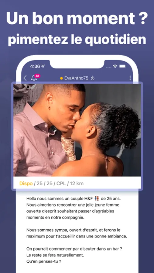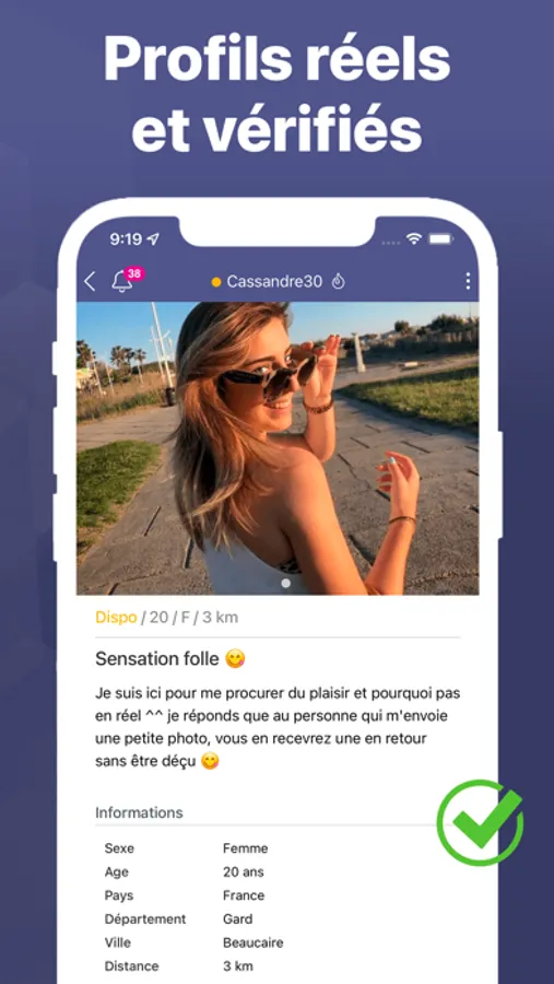 Tous les profils sont contrôlés individuellement avant leur parution sur l'app. Une seule inscription est autorisée par personne. Inscriptions soigneusement et manuellement vérifiées pour limiter les fakes, bots, abus et autres arnaques fréquentes sur les autres applications .