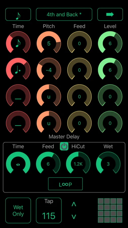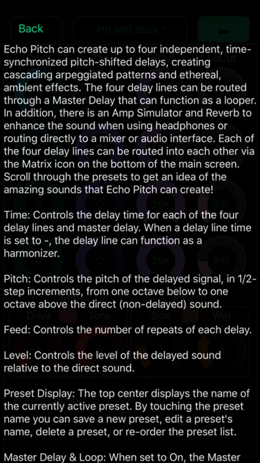 Echo Pitch pitch-shifting multi-delay for iPad and iPhone! Echo Pitch has 4 delays where each delayed signal can be pitched one octave up or down in 1/2 steps, and can function as a 4 voice harmonizer. Echo Pitch also has a built-in looper, amp simulator and reverb. Each of the four delays can be routed into the other for incredible, swirling, ambient washes and otherworldly sounds.
