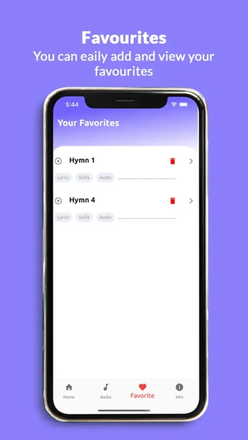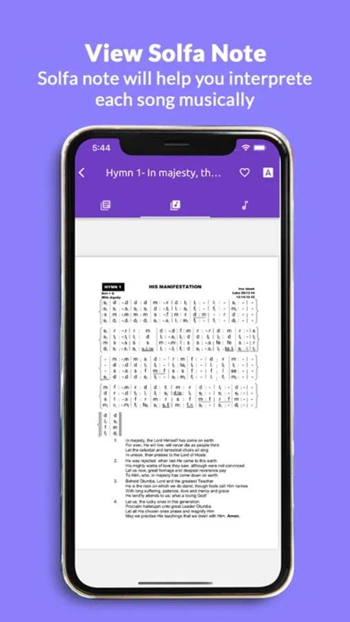 Hymns can be favorited, Searchable either by hymn numbers or first line indexes, Zoomed in and out for better viewing, Flipped between text and Sol-fa notation views, and Swiped right to un-favorite hymns.