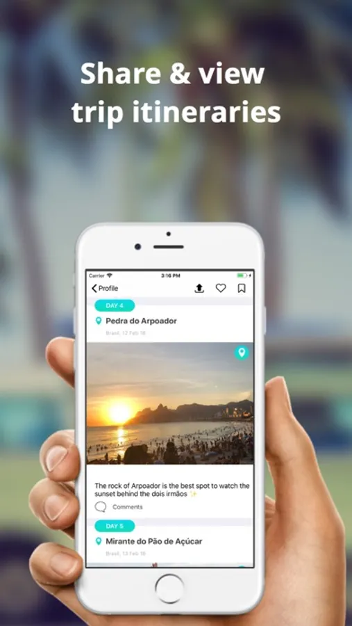 * Browse photos and trips from people you follow in your feed. Interact with trips you care about with likes and comments.