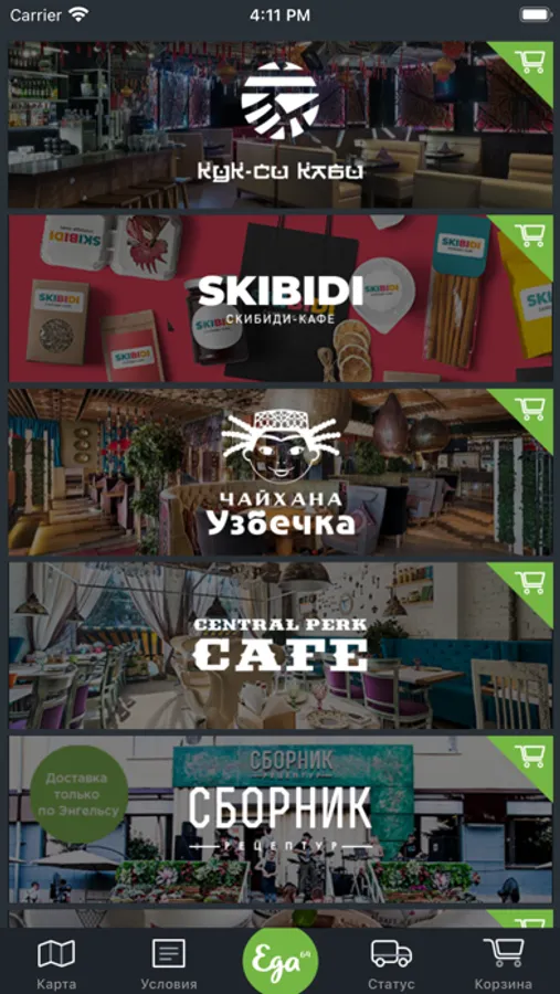 Сейчас мы доставляем из: Кук-си Каби, Узбечка, ДОМ, Central Perk, Lounge кафе Legio, Сборник рецептур, Кашеварня, Стейк-бар Мясо.