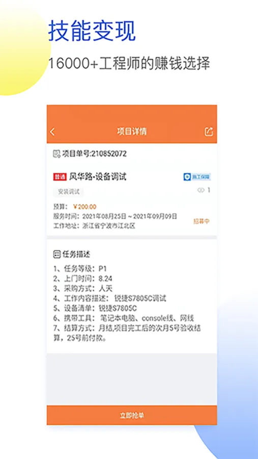网络工程师要接单,就上闪蝠平台,随时随地给工程师提供海量工单。闪蝠平台提供便捷项目支付,免除结款忧虑。