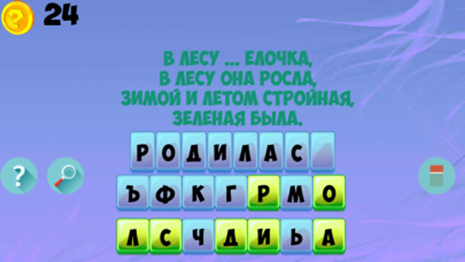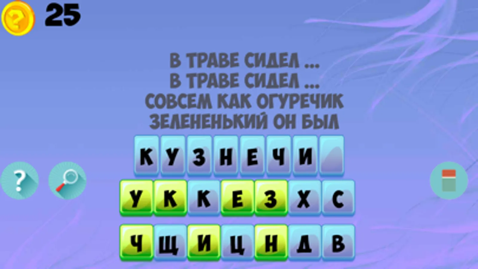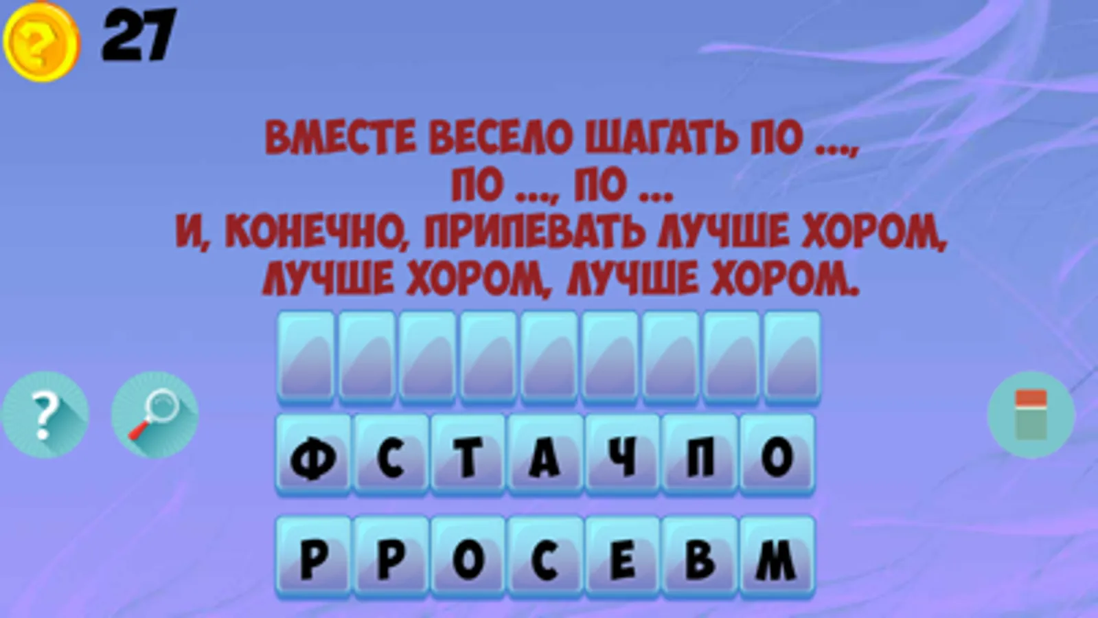 В игре закончи песню вам предстоит вспоминать или угадывать пропущенное слово в песне. Просто впишите по буквам недостающую фразу и песня будет полной. В игре несколько сотен песен на разные тематики: детские, военные, про любовь, популярные.