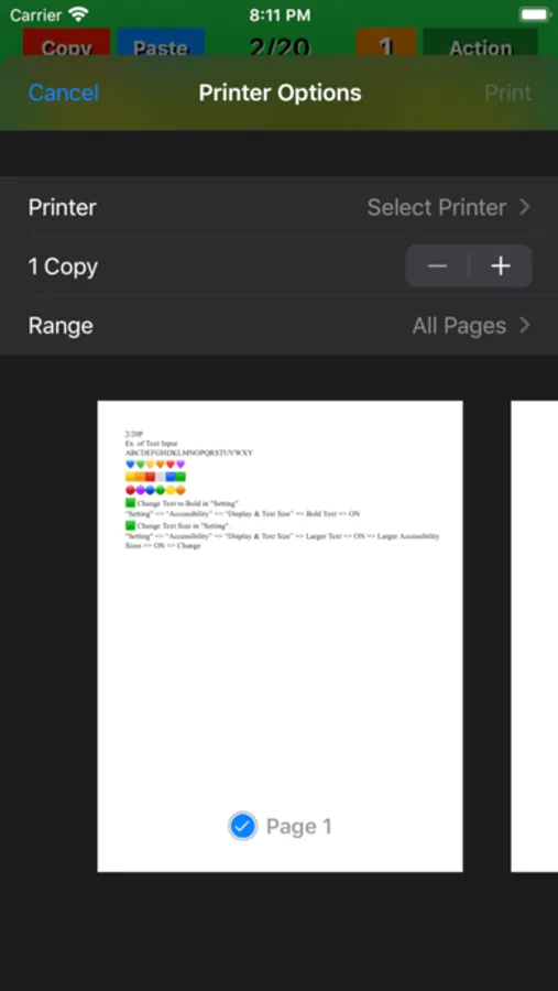 ● On any page, click the "Action" button, and a selection screen for email or print appears. Select "Print" and follow the instructions on the print screen. After selecting and checking the printer selection, number of prints, and print page range, press "Print" to execute printing. If you want to cancel, press "Cancel".