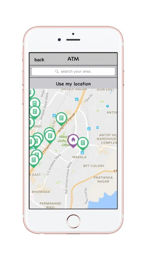 It allows you to enter location or choose your current location and based on that you can find near by ATMs, Gas Stations, Shopping malls.