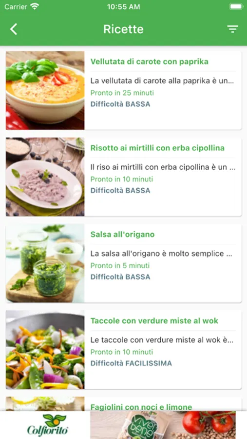 Accedendo alle ricette potrai avere soluzioni e idee per preparare gustosi piatti a base di frutta e verdura. Potrai cercare e selezionare la ricetta che più fa al tuo caso in base al tempo a disposizione, alla tipologia di piatto e alla difficoltà di preparazione.