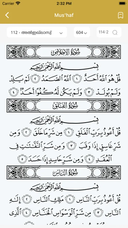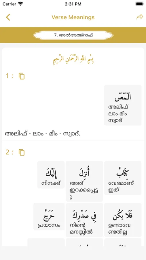 · Each Aayah carries audio of Mishari Al Afasi's recitation and Malayalam recitation in Noushad Ibrahim's voice.