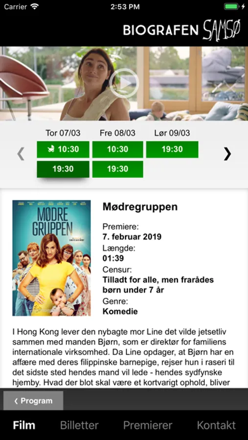 Med denne app har du mulighed for at gennemse programmet for Biografen Samsø, samt se yderligere filminformationer som trailer, censur, medvirkende skuespillere, varighed m.m.