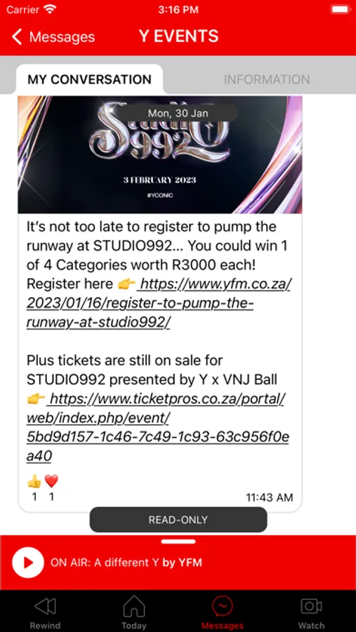 · Messages – Send free messages from the app to the YFM studio.