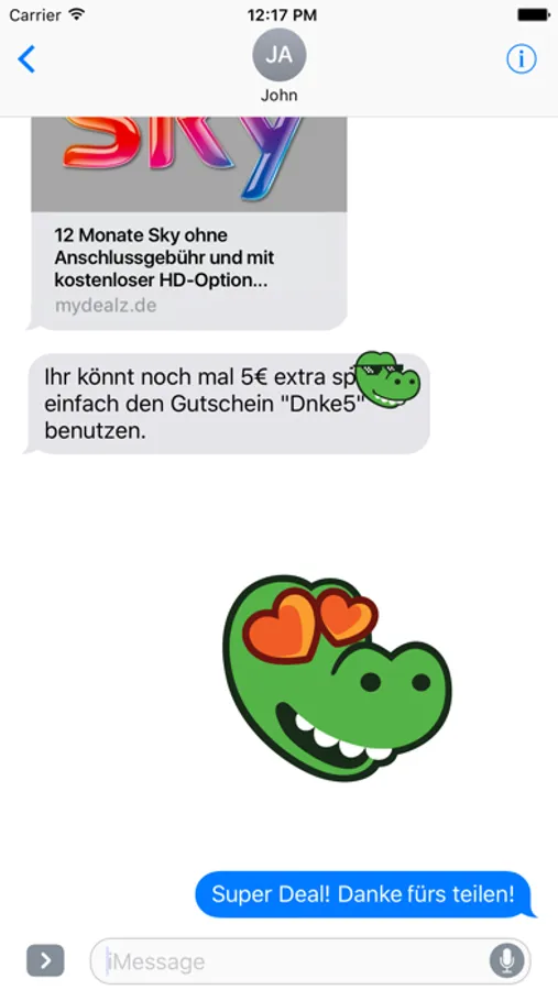 Mit der kostenlosen mydealz Dealoji App habt ihr eure Lieblings-Emojis von mydealz direkt auf eurem iPhone und könnt diese per iMessage an eure Freunde schicken. So könnt ihr beliebte Emojis wie z.B. das Nutella Kroko oder das Popcorn Kroko außerhalb der mydealz App nutzen.