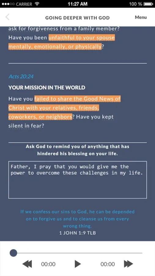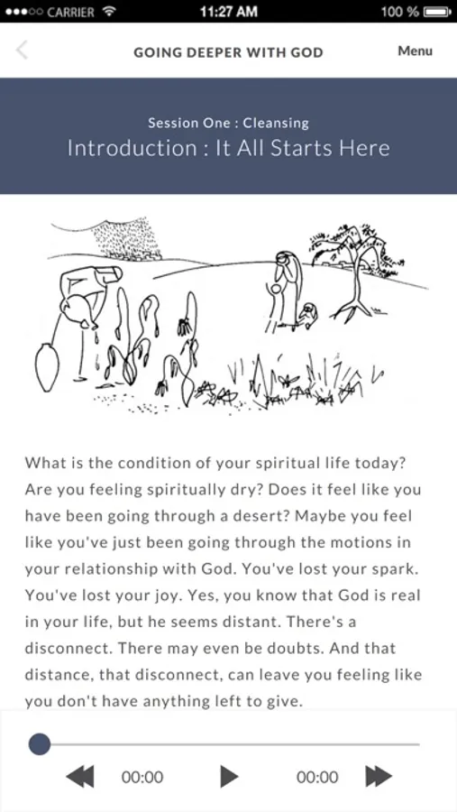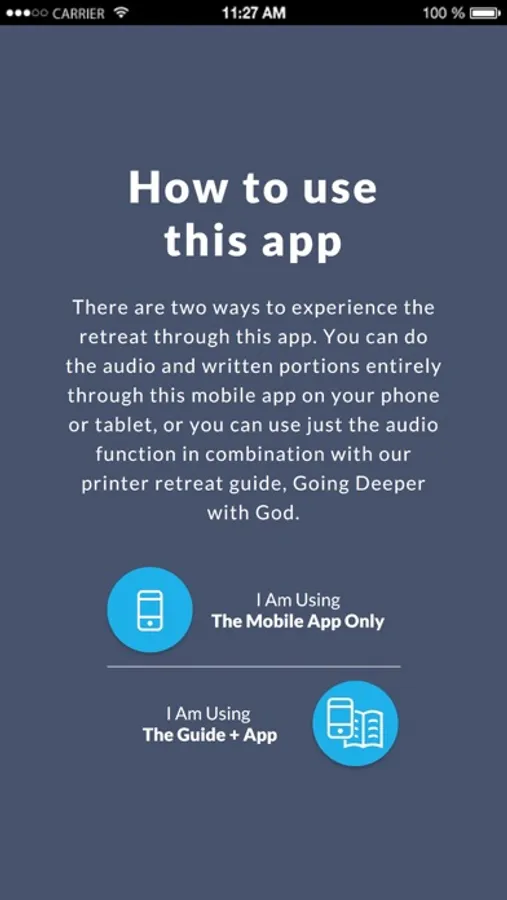 There are two ways to experience the retreat through this app. You can do the audio and written portions entirely through this mobile app on your phone or tablet, or you can use just the audio function in combination with our printed retreat guide, Going Deeper with God.