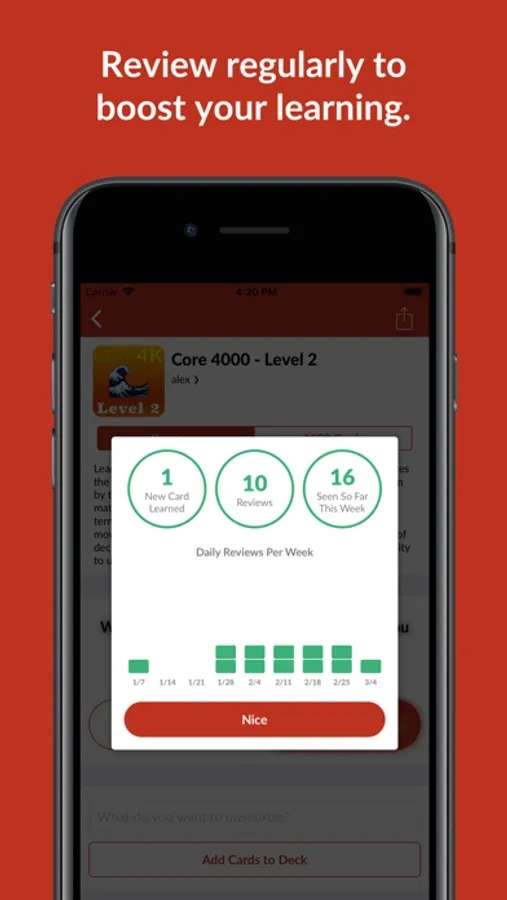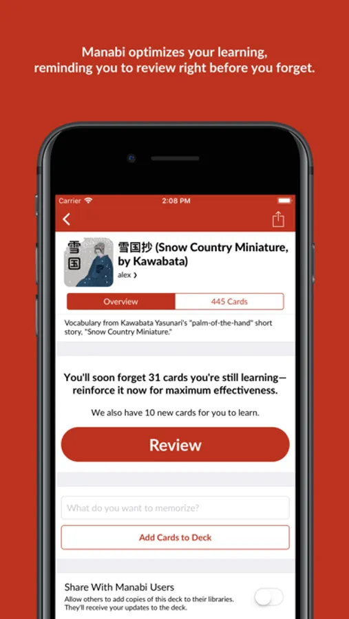 Manabi optimizes what and when you learn to make the most of your time. With its state-of-the-art spaced repetition algorithm, it'll remind you to review cards right as you're likely to forget them to maximize efficiency. If you fall behind, Manabi prioritizes the highest-impact cards rather than guilt-trip you about it.
