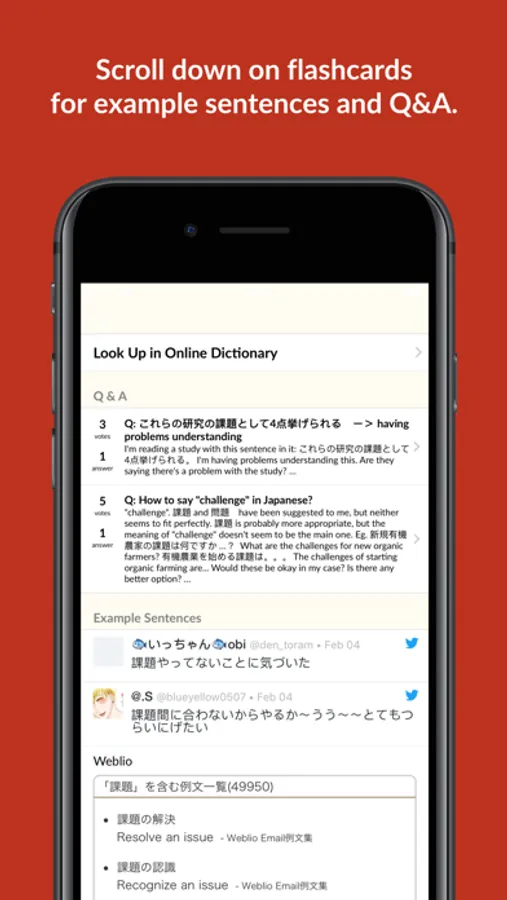 Learn more than just "the answers". Example sentences from native speakers on Twitter and Weblio are pulled in automatically, as well as relevant StackExchange Q&A. Just scroll down on a card to learn more and make those memories more vivid so that they stick!