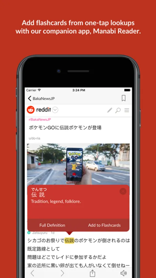 One of the best ways to learn Japanese is by reading native materials. Use our companion app, Manabi Reader, for one-touch dictionary look-ups that let you seamlessly add flashcards into Manabi for the words you come across.