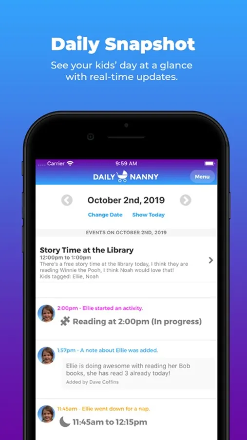 Nannies (and Parents!) can track daily information about kids like naps, bottles, meals, medicine, and more. Parents get push notifications when notable events happen during the day!