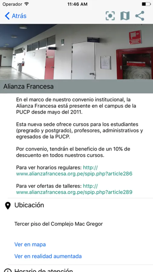- Acceder a la información de más de 200 lugares dentro la PUCP como facultades, bibliotecas, fotocopiadoras, auditorios, cafeterías, etc. Podrás ver descripciones, fotos, horarios de atención, números o correos electrónicos de contacto, enlaces y lugares relacionados, entre otros.