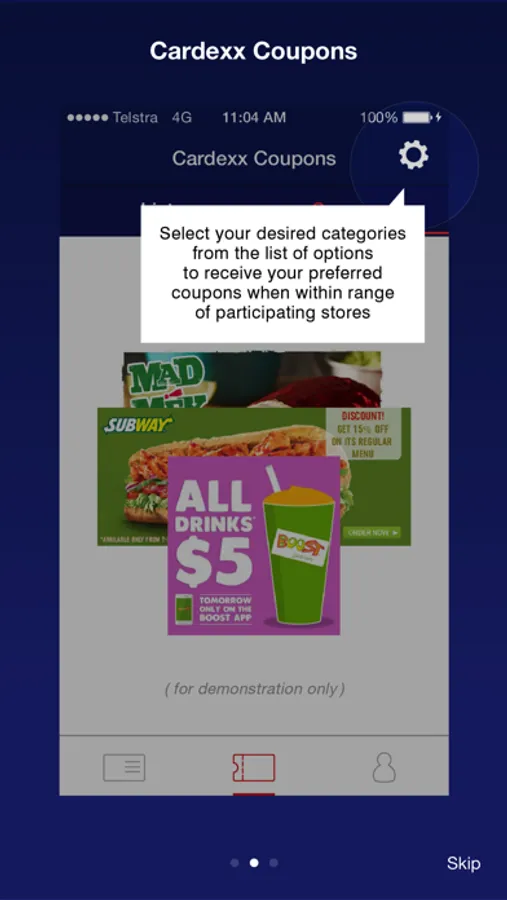 The user will preselect their relevant Coupon ‘categories’, leaving the user in full control of which promotional items they will receive. Coupons can either be marketing/advertisement or as simple information notifications.