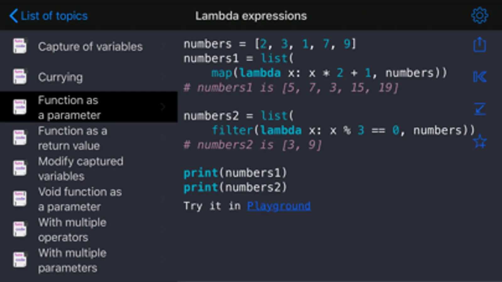 A must have app for any consultant. Rather than being a lexicon of coding descriptions and commands, as so many of these apps are, Fedor has provided a reference tool for real-world developers. There are three main areas of the app; list of topics leading to subject menu, explanation page, settings. Starting with the list of topics, the index is broken into logical sections that direct the developer quickly to a sub-menu and the area needed - precisely where a developer would expect to find what they’re looking for. The explanations in each and every page are succinct, well thought out, and clearly presented with excellent examples where needed. There is no boiler plate generic definitions here. The ‘settings’ section is equally efficient. It allows to switch to dark, change font and size, upgrade/release additional language examples, or simply upgrade to a full and ad-free version. It should be noted that the cost and features of a fully upgraded ‘Codes recipes’ app is the same as buying the ‘Codes recipes PRO’ version. Fedor, thank you for developing this app - it’s excellent.