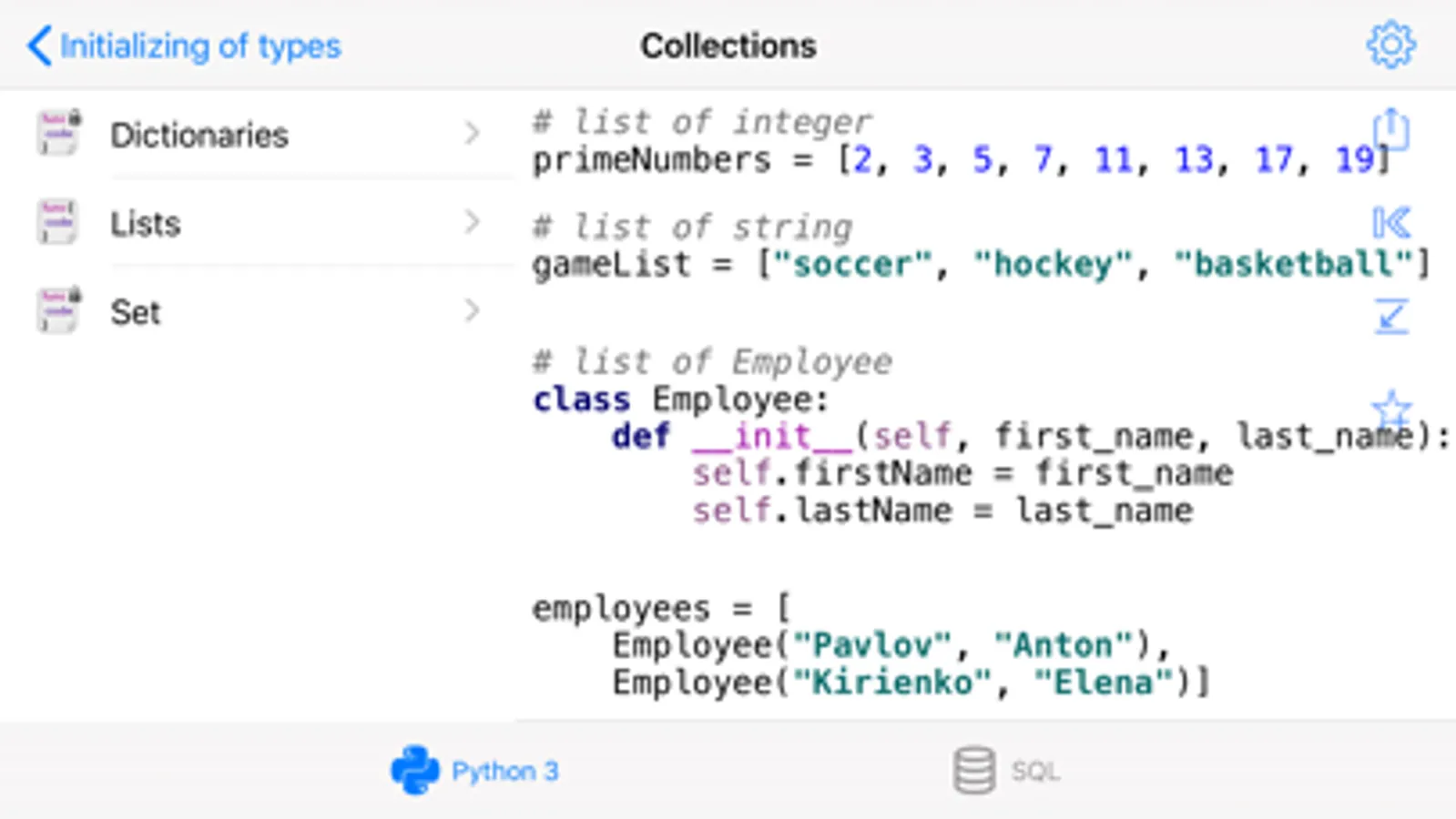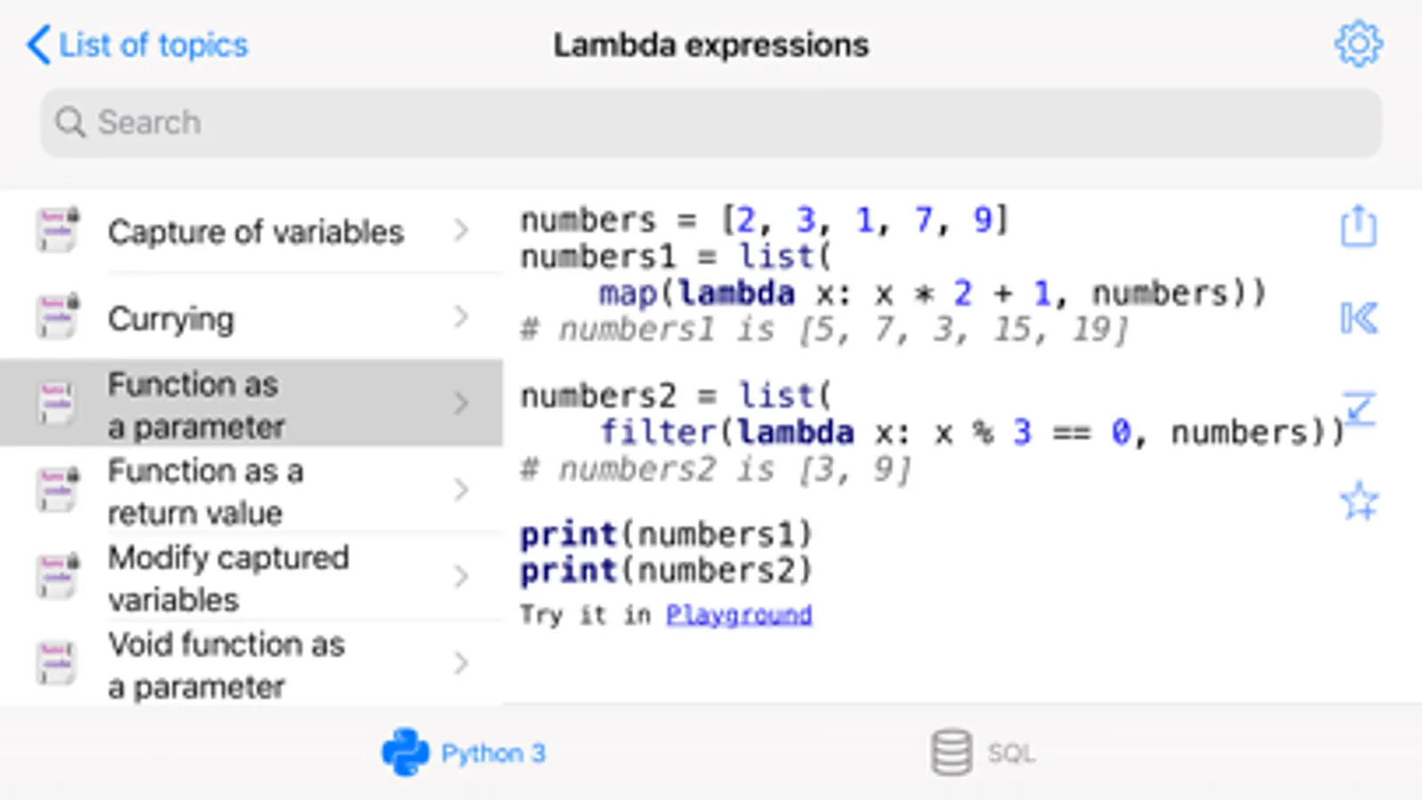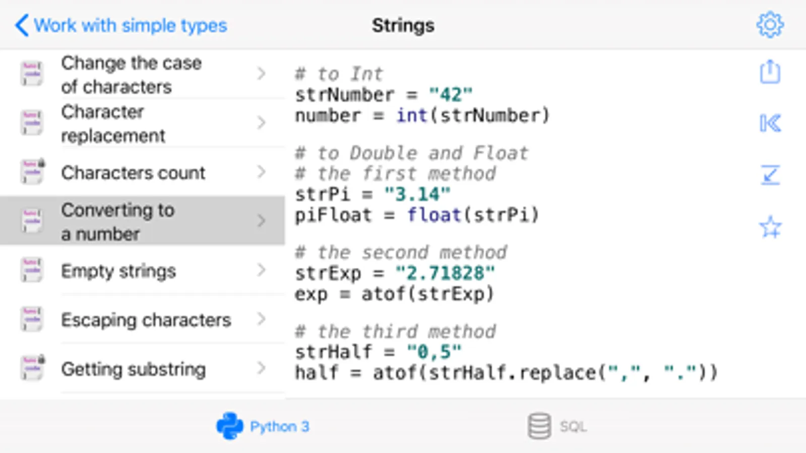 • The application is a good tool during the exam or the preparation to the interview because it contains a reference to frequently used operations in different programming languages.
