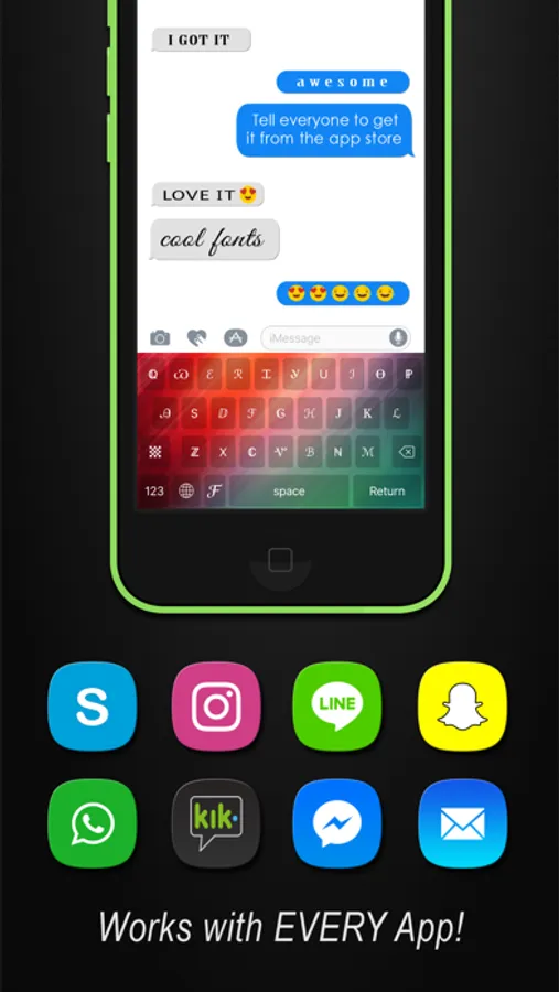 Customize your device with tons of awesome and unique fonts that work in EVERY app. Works in Email, iMessage, Line, WhatsApp, Snapchat, WeChat, Kik, QQ, Instagram, Youtube, and any font keyboard you can type in!