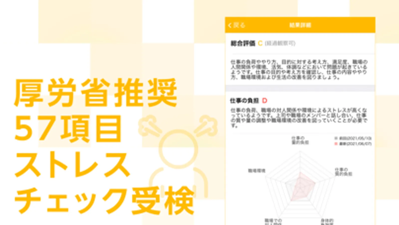 厚労省推奨の「職業性ストレス簡易調査(57項目)」含む4種のストレスチェックを、無料で何度も受検可能!独自の5段階判定により、医師監修のアドバイスをお届けします。