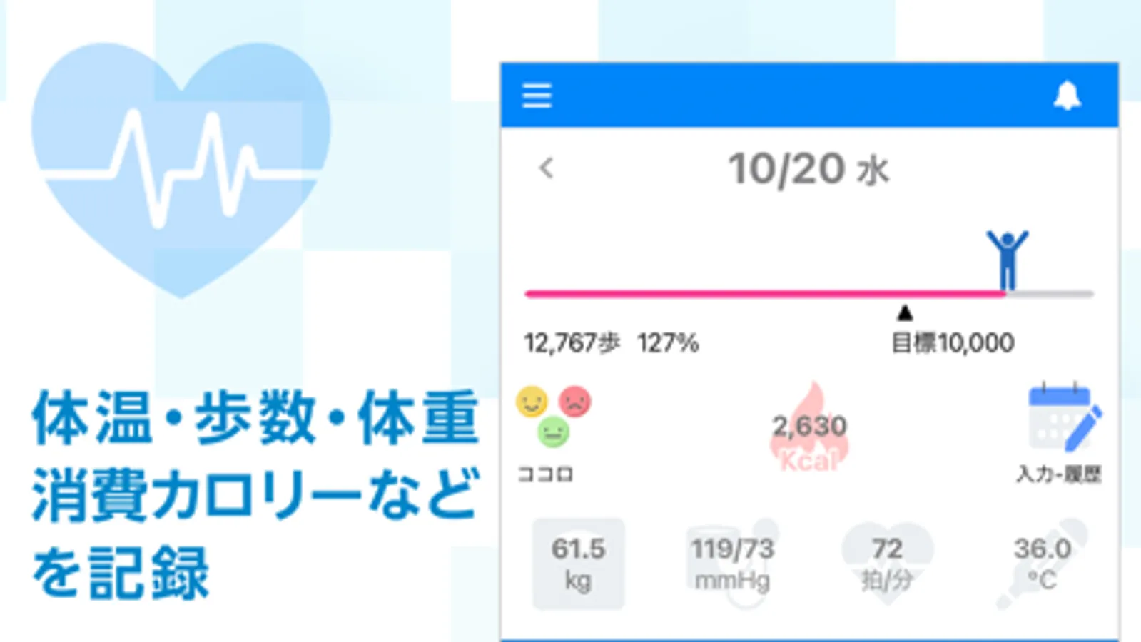 ◎毎日6つの体調記録(歩数・体温・体重・血圧・心拍数・消費カロリー)