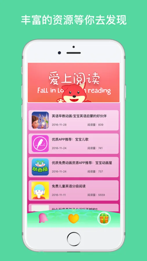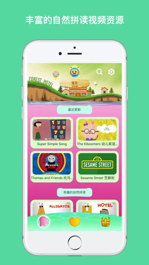 各种海量资源免费用!最热动画片、纯正英文儿歌给孩子们磨耳朵、加上专为宝贝设计的亲子英语小游戏,全方位打造学习系统!