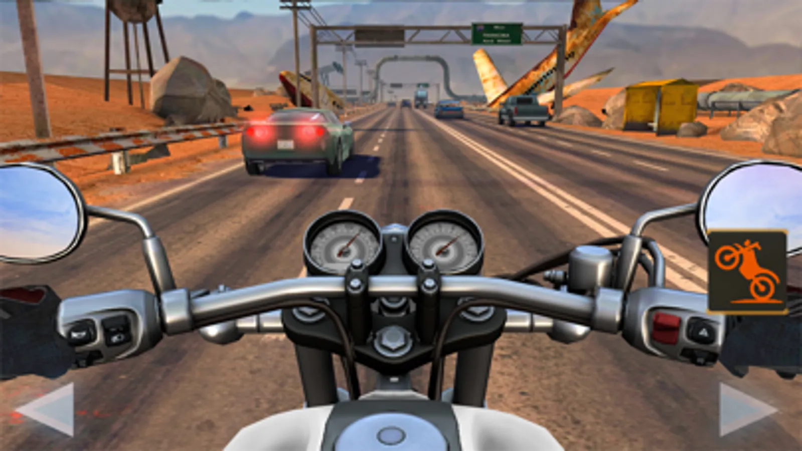 Head out and race as fast as you can to become the best new moto rider in the world! Race the traffic and complete the challenges to get real among the competition. Jump on your racing bike and ride in the endless busy roads and highways! Make near traffic misses discovering 4 unique locations: Suburbs, Desert, Snow and Night City in 4 different modes! Ride your motorcycle on a highway, interstate, or the autobahn. Never forget that riding a motorcycle can be fun, but it can also be dangerous! Roads and highways are full of speeding cars – they can bother you!
