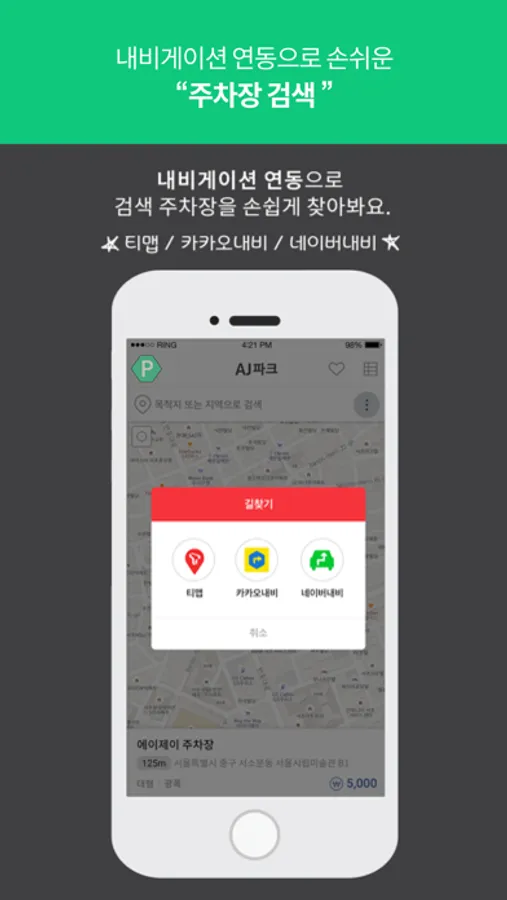 - 주차요금 할인정보: 목적지 주변 주차장과 연계된 제휴업체 및 요금 할인정보를 제공하여 합리적 주차를 도와줍니다.