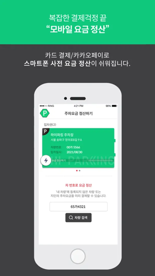 하이그린파킹 앱을 이용하시면 한 번에 빠르고 쉽게 주차를 할 수 있게 도와드립니다. 주차비 할인은 보너스!