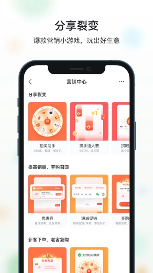 (5)营销百宝箱:自带红包雨、优惠券、满减促销、抽奖大转盘等多种营销工具,助你搞定引流、裂变和复购,另外每月还会为你定期更新海报和配图文案,一键即可转发至朋友圈。