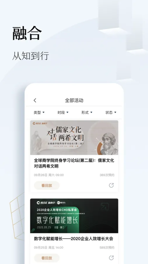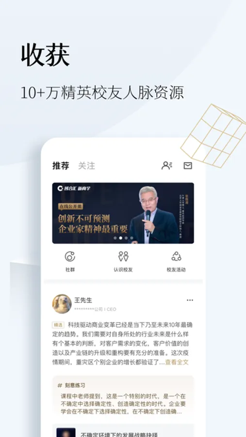 创合汇APP打破大学围墙,整合全球优质商学教育资源,为创新者和创业者构建终身学习成长平台。