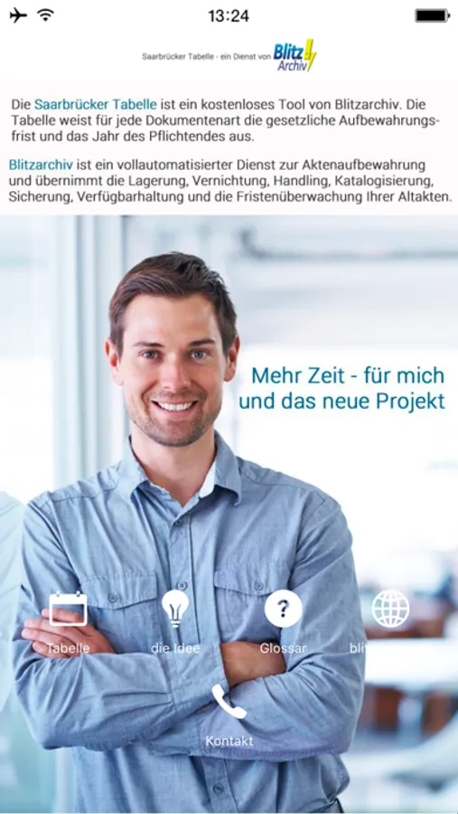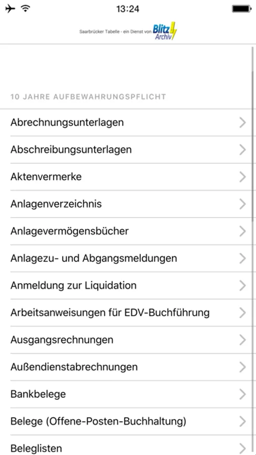 Diese App und die Saarbrücker Tabelle sind kostenlose Tools von Blitzarchiv. Blitzarchiv ist ein vollautomatisierter Dienst zur Aufbewahrung von physikalischen Akten und übernimmt die Lagerung, Vernichtung, Handling, Katalogisierung, Sicherung, Verfügbarhaltung und die Fristenüberwachung Ihrer Altakten.