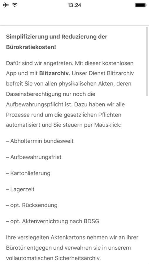 Die Tools und Dienste von Blitzarchiv richten sich nur an Unternehmen, Gewerbetreibende und Freiberufler innerhalb Deutschlands. Blitzarchiv ist ein Dienst der Aktentreuhand DE GmbH.
